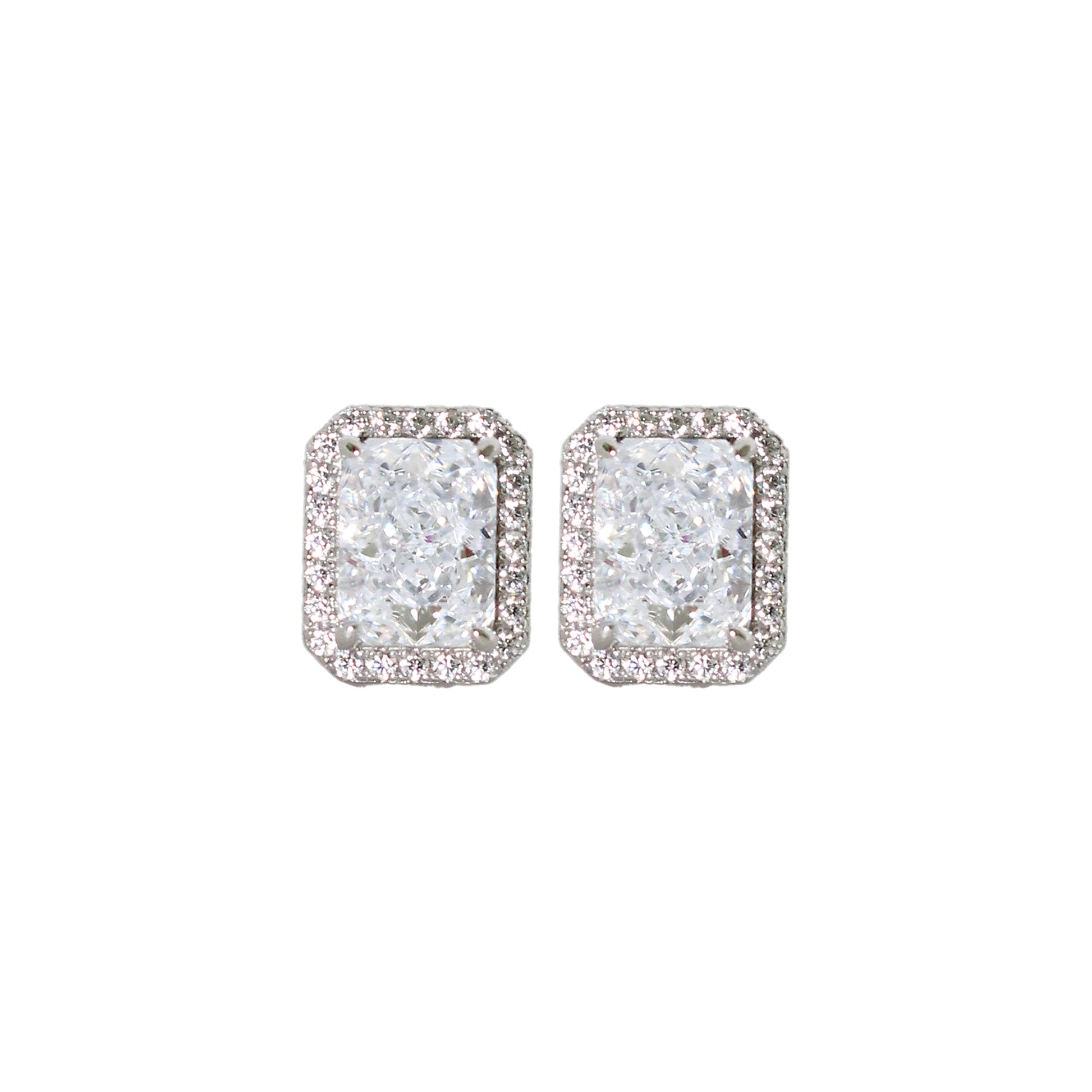 Minimalismo con impacto. Estos aretes tipo stud presentan un cuarzo blanco en corte radiant, rodeado por un halo de piedras más pequeñas que acentúan su brillo y lo elevan a un nivel de elegancia atemporal.