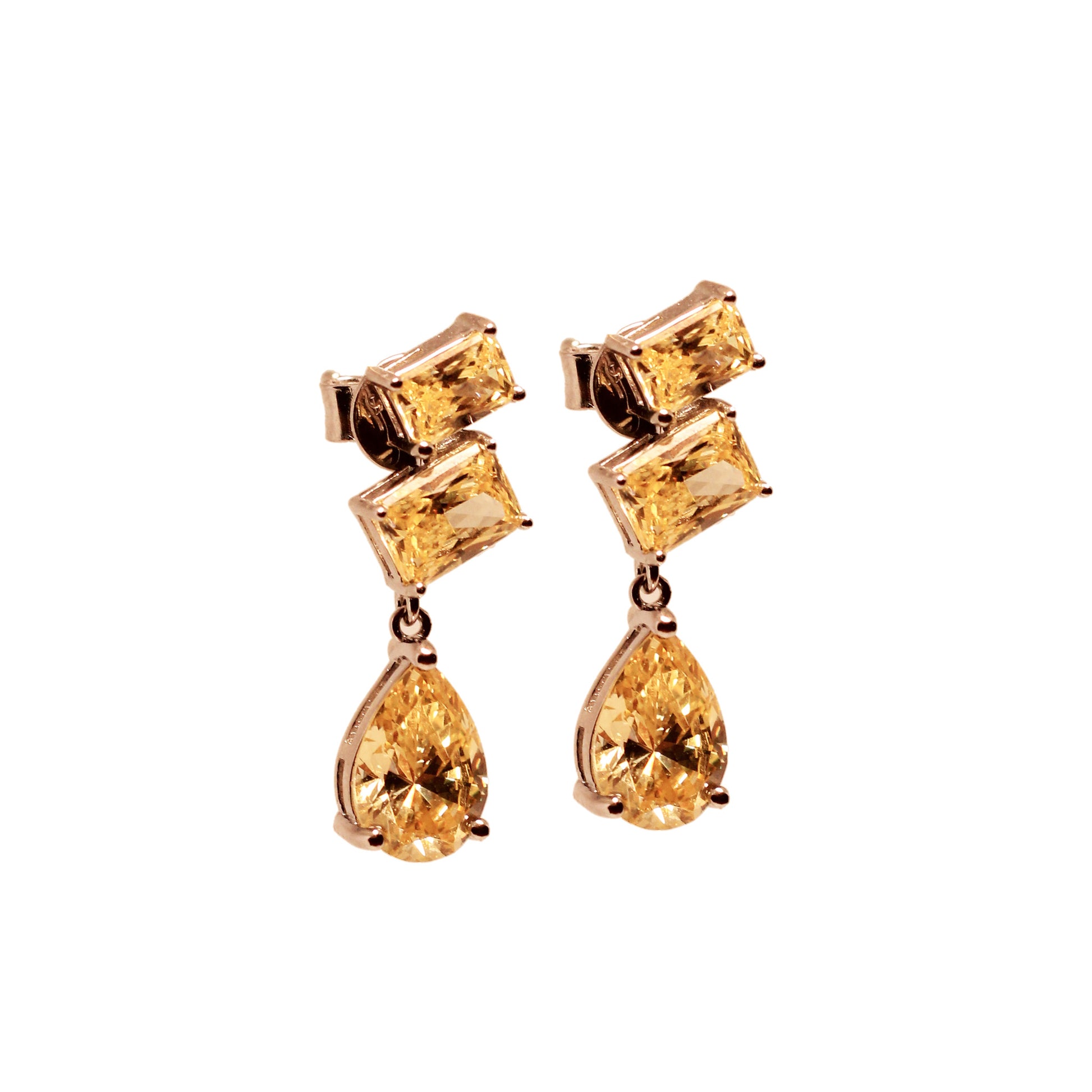 Diseño geométrico con movimiento y luz. Estos aretes combinan topacio amarillo en corte baguette y corte gota para lograr una caída estilizada, moderna y cargada de brillo.